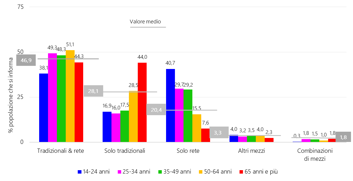 La frattura generazionale determina un digital divide informativo (Figura 2): il 40,7% dei più giovani si informa solo tramite la Rete, mentre gli anziani restano legati ai mezzi tradizionali (il 44% ne fa uso esclusivo). Per le fasce intermedie della popolazione prevale la multicanalità, con una forte integrazione tra mezzi tradizionali e rete.