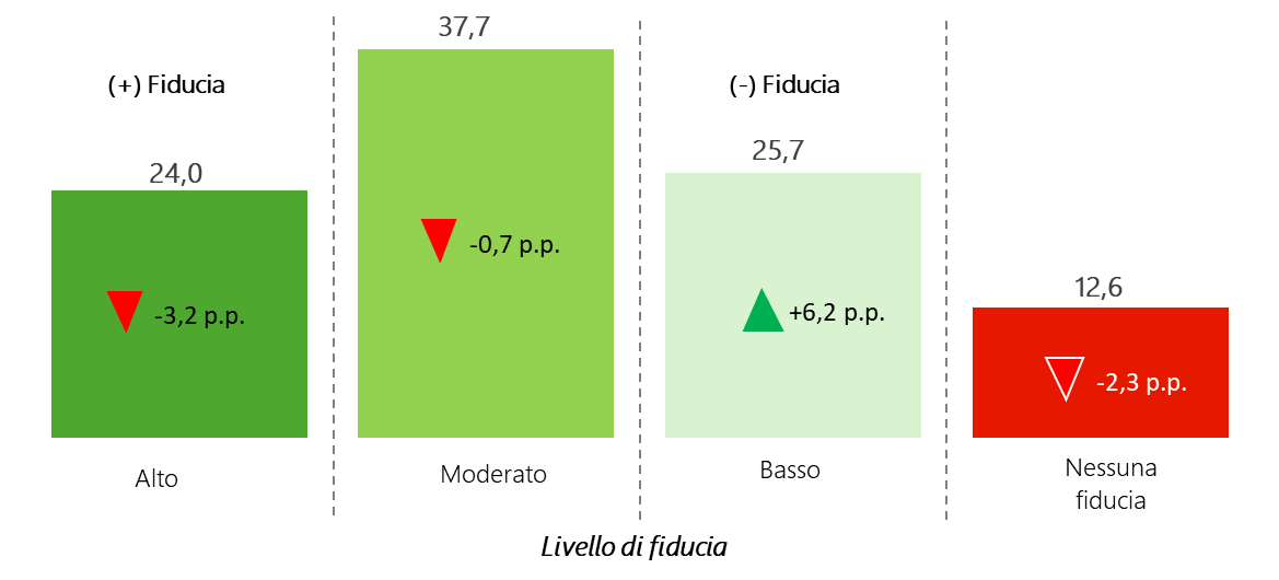 Nel complesso, si riscontra un calo nei livelli fiducia nelle fonti informative (Figura 3): si riduce la percentuale di persone che manifesta un livello alto o moderato di fiducia e aumenta la quota di chi dichiara di averne poca.