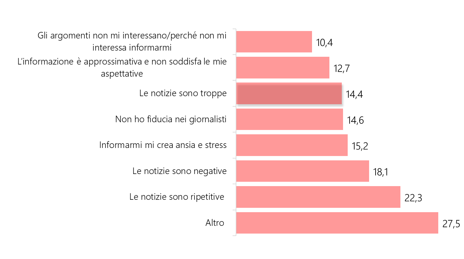 I fattori che influenzano la scelta di evitare le notizie descrivono una strategia di autodifesa più che disinteresse. Infatti, le notizie sono percepite come ripetitive (22,3%), negative (18,1%), generatrici di ansia e stress (15,2%), eccessive (14,4%), a cui si aggiunge la mancanza di fiducia nei giornalisti (14,6%). Le motivazioni variano con l’età: i più giovani percepiscono in misura maggiore un sovraccarico informativo e mostrano disinteresse; i 25-34enni risultano sensibili all’impatto emotivo e alla negatività delle notizie; gli over 65 lamentano soprattutto la qualità e la ripetitività dei contenuti informativi. Incidono anche fattori come disponibilità di tempo, livello di istruzione e reddito.