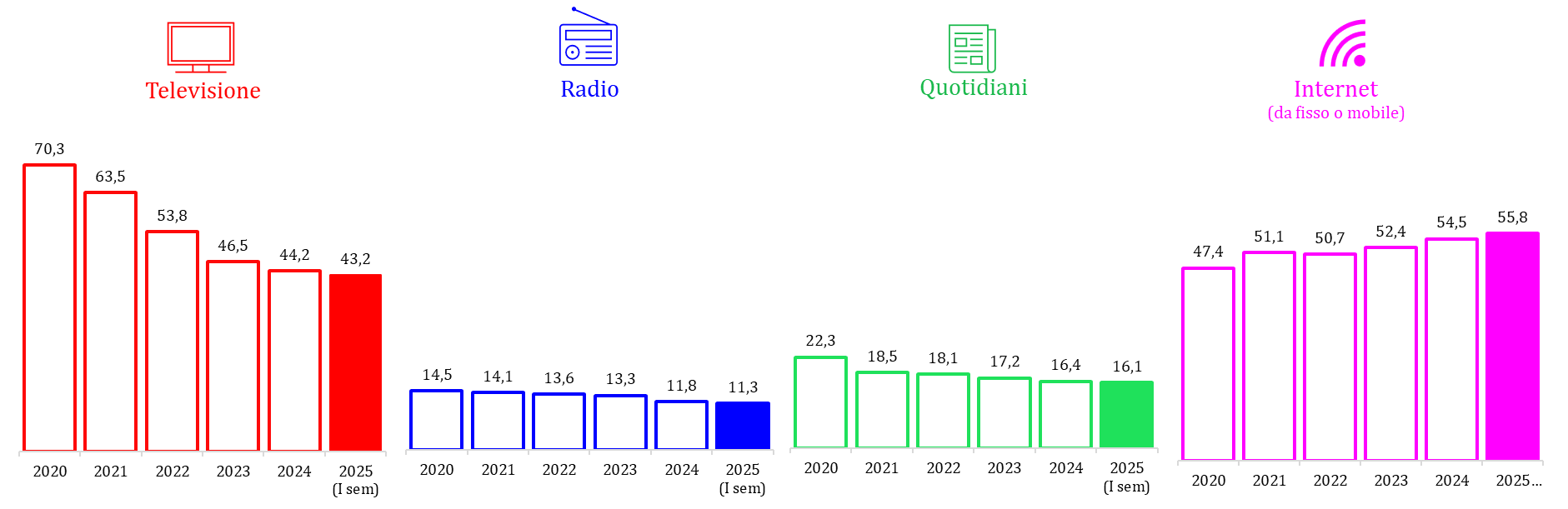 Dopo il sorpasso sulla televisione del 2023, Internet rafforza la sua posizione rappresentando nel primo semestre del 2025 la prima porta d’accesso all’informazione per il 55,8% degli italiani, ampliando ancora il divario con la TV, che scende al 43,2%.